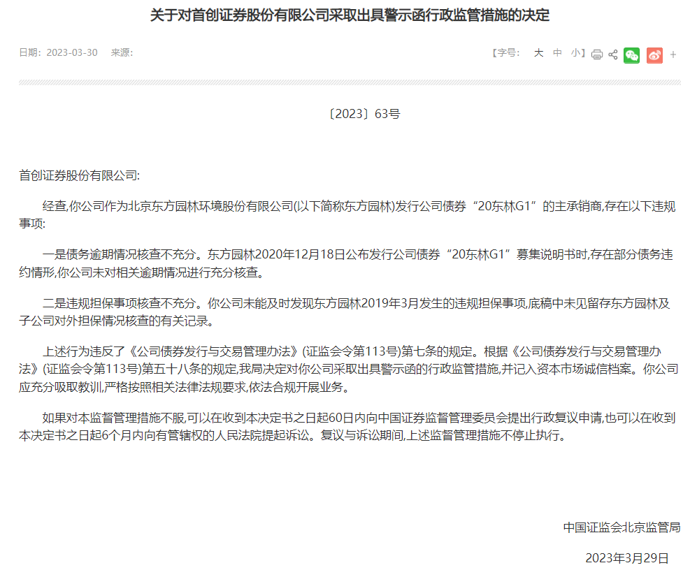 细想之下,其实这还不是首创证券上市以来的首份罚单。今年3月,北京证监局点名首创证券担任“20东林G1”主承销商,对债务逾期情况和违规担保事项核查不充分,对其予以监管警示,记入诚信档案。