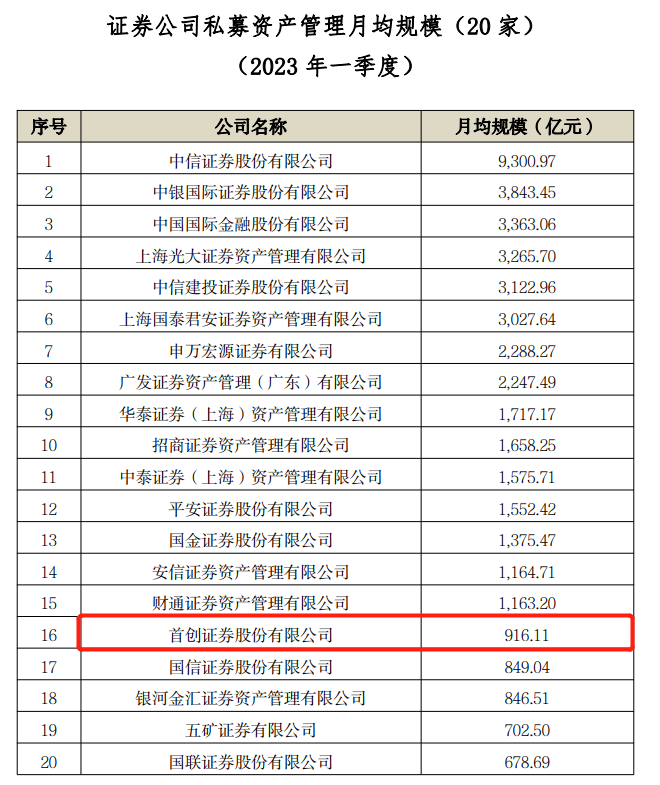 2023年一季度,首创证券私募资管月均规模位916.11亿元,在证券公司中排名第16位,超过国信证券和银河金汇,后者分列第17、18位。